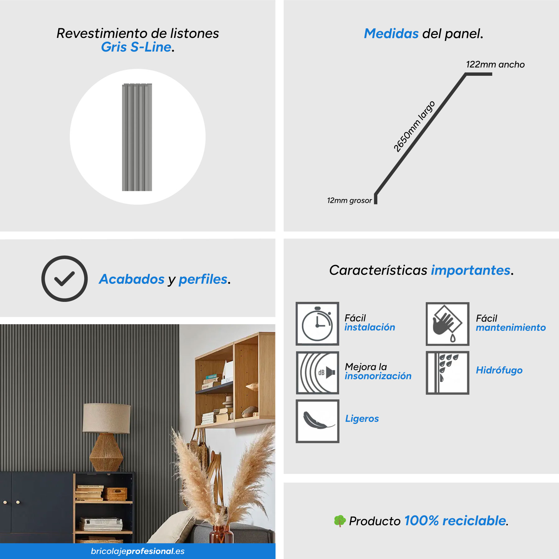 Renueva tus espacios con el panel de listones Linerio Monocolor Gris S-Line. Diseñado para aportar estilo y modernidad, este revestimiento de listones de poliestireno es ligero, resistente y fácil de instalar. Su acabado en tono gris neutro se adapta a cualquier decoración, mientras que su estructura mejora la acústica al reducir el eco. Su montaje es rápido y sin complicaciones, ya que solo necesitas adhesivo para fijarlo a la pared. Ideal para salones, dormitorios, oficinas o recibidores, estos frisos de listones de PVC grey son la solución perfecta para transformar cualquier ambiente con un diseño elegante y sofisticado.