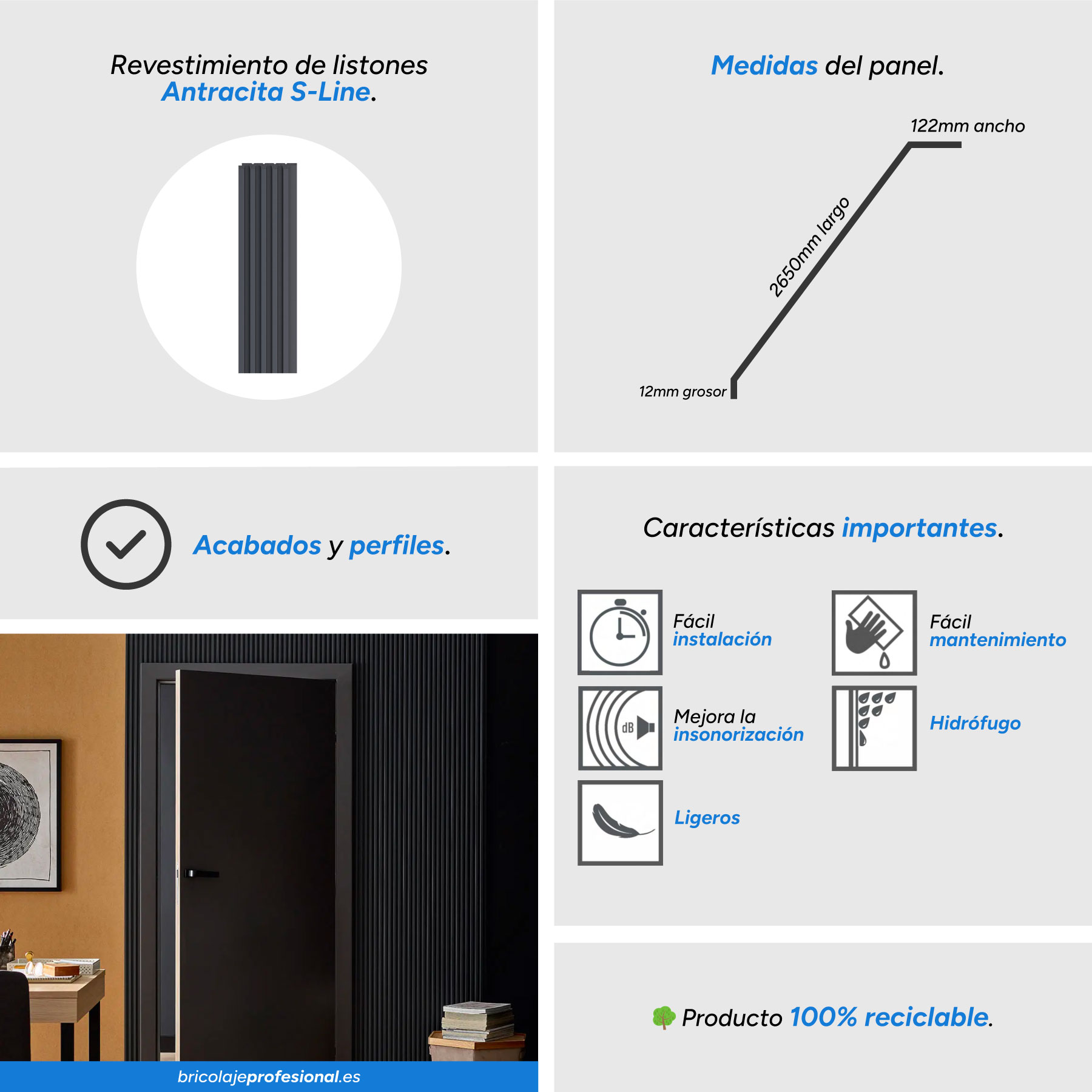 Dale un toque sofisticado y moderno a tus espacios con el panel de listones PVC Linerio Monocolor Antracita S-Line. Su diseño tridimensional realza cualquier ambiente, aportando elegancia y profundidad. Fabricado en poliestireno 100% reciclable, es resistente a la humedad, fácil de limpiar y mejora la insonorización del entorno. Su instalación es rápida y sin complicaciones, ya que solo necesitas adhesivo para fijarlo a la pared. Ideal para salones, dormitorios, oficinas y tiendas, su versatilidad permite montarlo horizontal o verticalmente. Renueva tus paredes sin obras y transforma tu hogar con un acabado premium y contemporáneo.