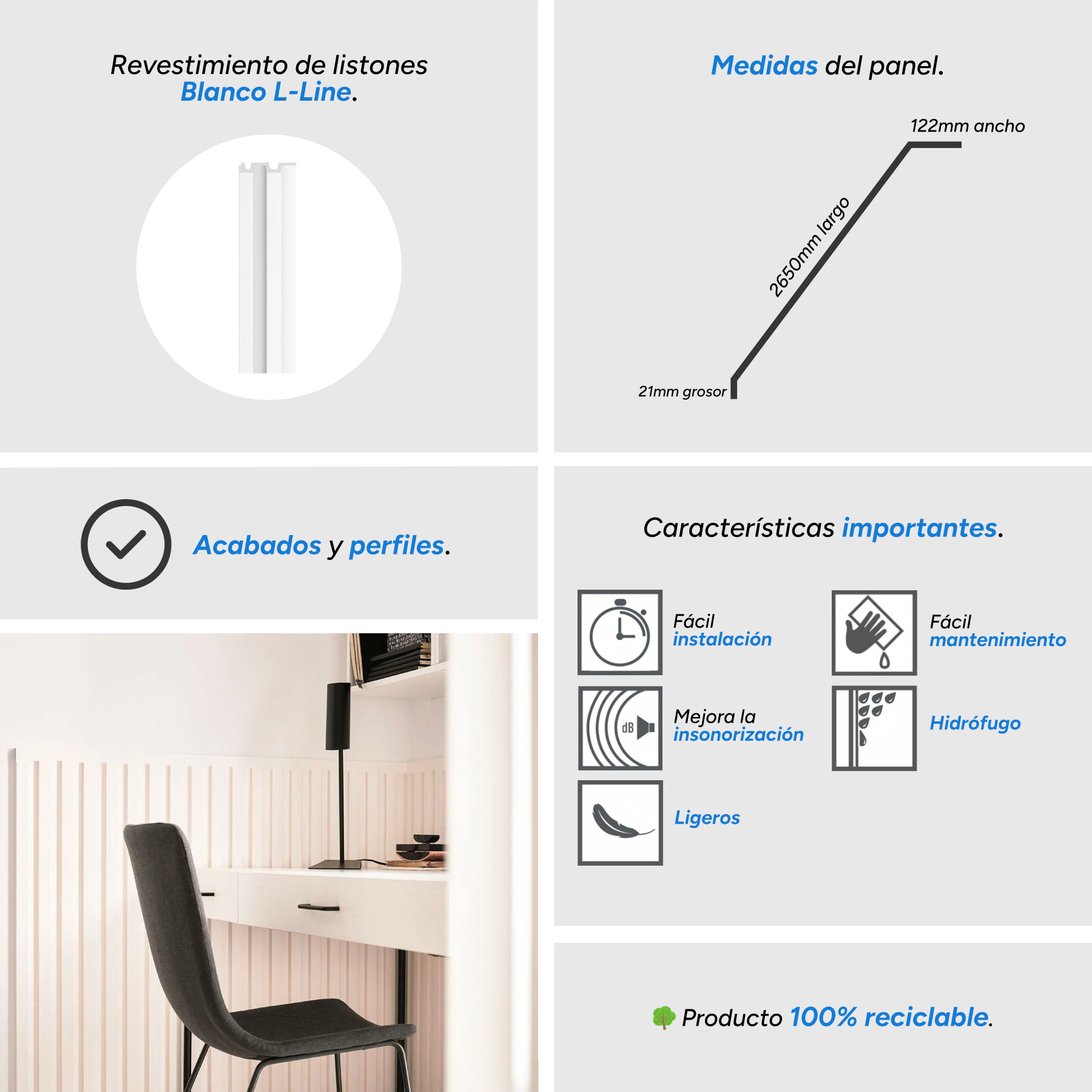 Dale un nuevo aire a tus espacios con el panel de listones PVC Linerio Blanco L-Line de 2650x122x21 mm, la solución perfecta para un diseño moderno y elegante. Su acabado en poliestireno reciclable imita la madera, pero con mayor durabilidad y sin mantenimiento. Ideal para decorar paredes en salones, dormitorios u oficinas, su instalación es rápida y sencilla con adhesivo, sin necesidad de herramientas complicadas. Además, su estructura ayuda a reducir el eco y mejorar la acústica, creando ambientes más confortables. Resistente a la humedad y fácil de limpiar, es perfecto para cocinas y zonas de alto tránsito. ¡Transforma tu hogar sin esfuerzo!