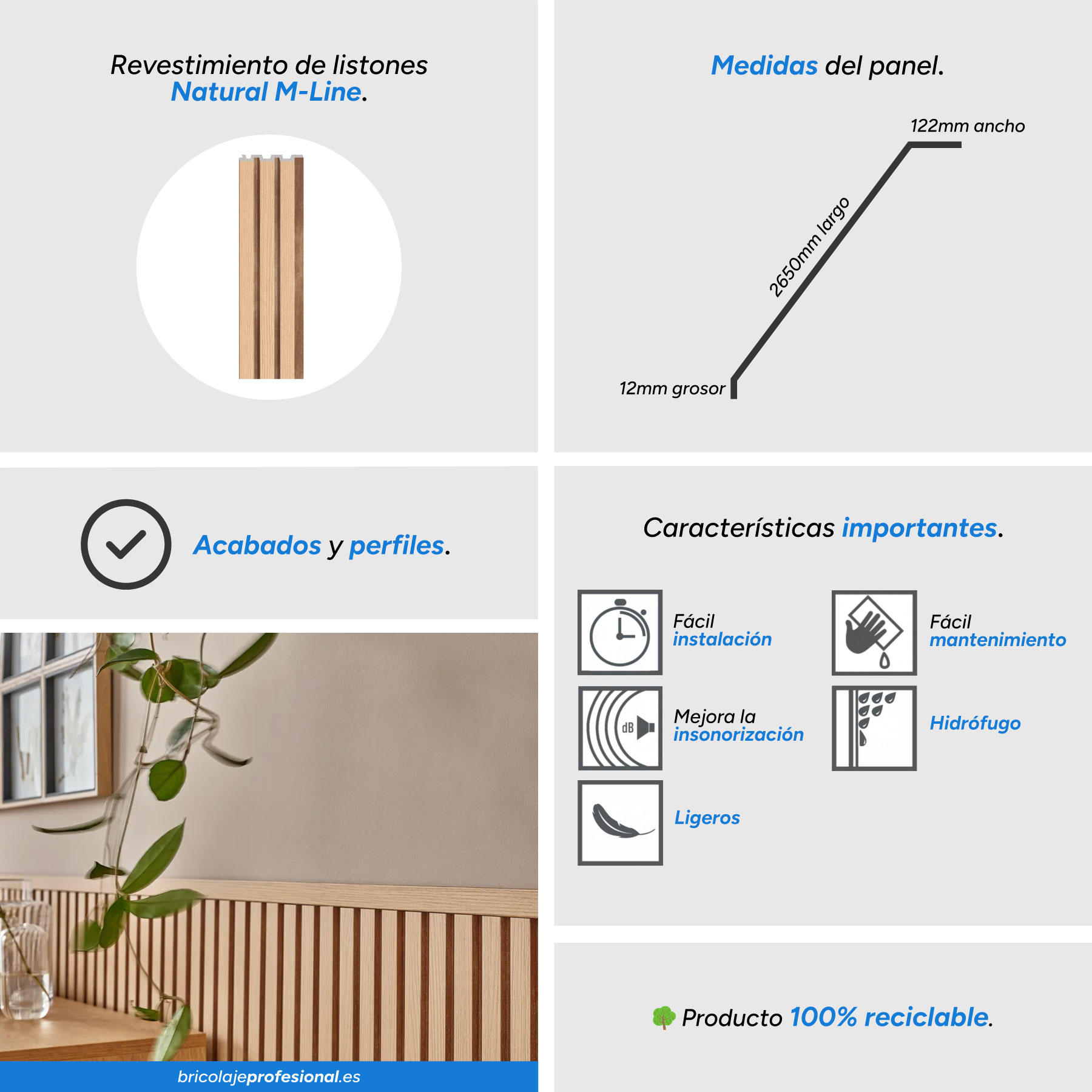 Transforma tus espacios con el Panel de Listones PVC Linerio Natural M-Line. Con un diseño moderno y elegante, este revestimiento alistonado es ideal para renovar paredes sin necesidad de grandes reformas. Fabricado en poliestireno XPS, es 100% reciclable, resistente al agua y fácil de instalar con adhesivo. Su acabado en madera natural aporta un toque sofisticado a salones, oficinas, baños y comercios. Además, mejora la acústica del espacio reduciendo el eco. Disponible en 2,65 m x 12,2 cm x 1,2 cm, se corta fácilmente para adaptarse a cualquier superficie.