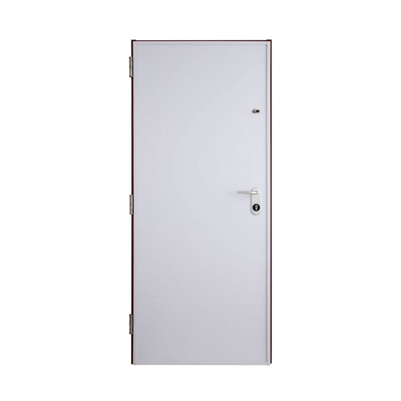 Herraje | Niquel satinado. Incluye llamador, asa, clavos, mirilla y manivela de serie. |