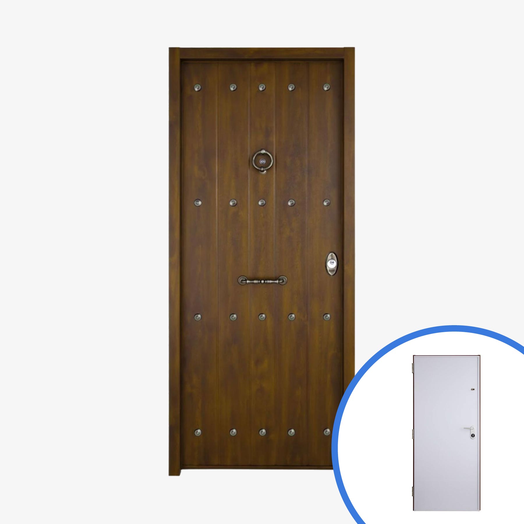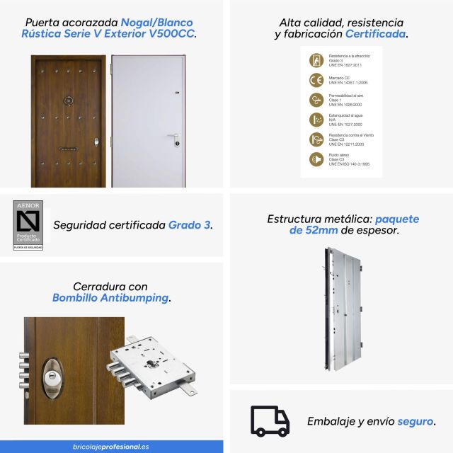 Descubre la Puerta Acorazada Rústica, una combinación perfecta de seguridad certificada y diseño tradicional. Diseñada para proteger tu hogar con la máxima resistencia, su acabado en madera de nogal le aporta un estilo cálido y elegante. Con aislamiento térmico y acústico, mantiene el confort en el interior del hogar.
