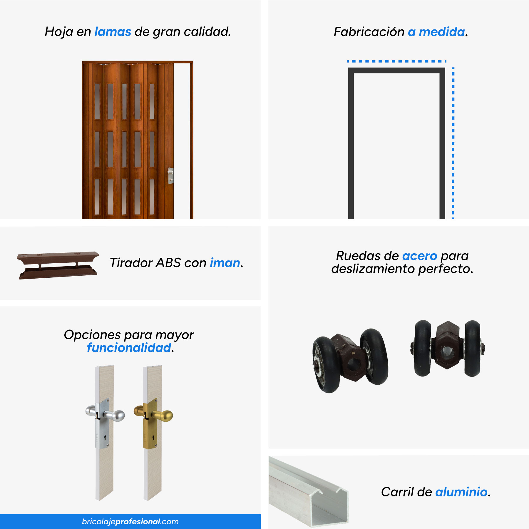 Nuestra puerta plegable PVC cerezo con cristalera combina elegancia y funcionalidad. Con lamas adornadas con cristales rugosos, mates o biselados, ofrece una solución estética y práctica para cualquier hogar u oficina. Fabricada en PVC de alta calidad, garantiza durabilidad, resistencia a la humedad y fácil mantenimiento. Se adapta perfectamente a tus necesidades. Instálala sin complicaciones y disfruta de un ambiente luminoso y moderno.