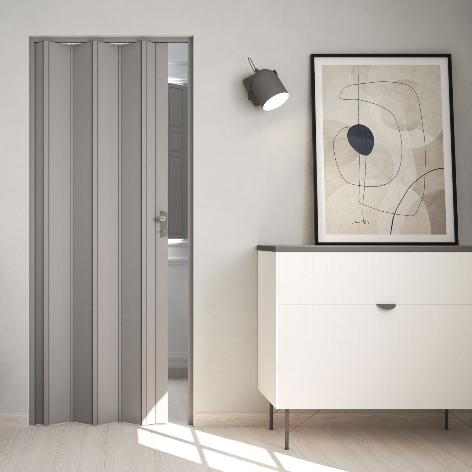 La puerta plegable gris es la solución perfecta para cualquier espacio. Fabricada en PVC de alta calidad y diseñada con lamas lisas, ofrece una estabilidad y durabilidad excepcionales. Ideal para cualquier habitación, su color gris elegante y moderno se adapta a cualquier decoración. Esta puerta plegable a medida garantiza una instalación sencilla y una funcionalidad impecable, certificada bajo los más altos estándares de calidad ISO 09001:2018.
